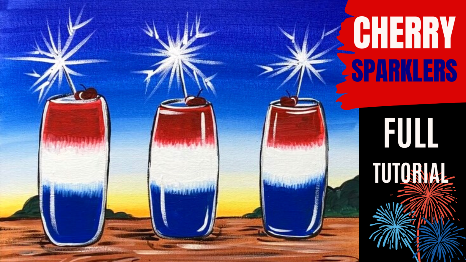 Hello again, beautiful artists, and happy almost 4th of July to all my US-based viewers! This week I wanted to capture the mood of a 4th of July party at dusk, perhaps with friends on a balcony overlooking where fireworks will soon begin? And we have topped our imaginary “cherry sparkler” cocktails with a sparkler! So fun. Paint along step by step and capture the vibes of July in the US with me. Happy painting, happy independence day, and stay creative!