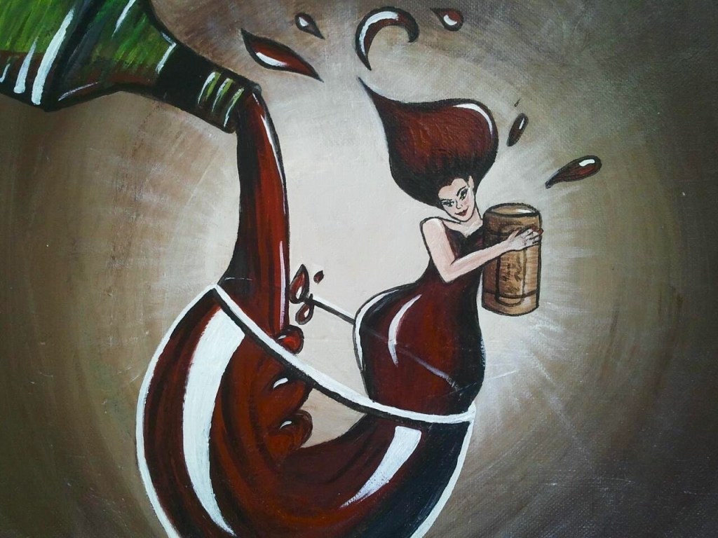 Early work: Left: Port San Luis “View From Pete’s” circa 2004. Right: Commissioned piece, “Uncorked” circa 2010s.